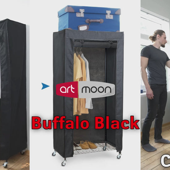 art moon Buffalo - Schwerlast Faltschrank Kleiderschrank, mit Abdeckung, bis 70 kg, Stabil Kleiderschrank auf Rollen, 2 Ablagen, Schwarz Baumwolle